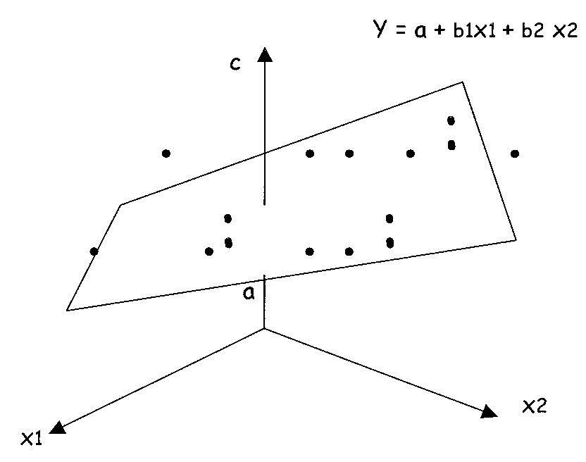 We assume that c is a function of several inputs x1, x2,...xn (independent variables), and the goal is to find the best regressor of c on all the inputs (Figure above). For Dimemsion = 2 this corresponds to fitting a plane through the N input samples or a hyperplane in the general case of N dimensions.